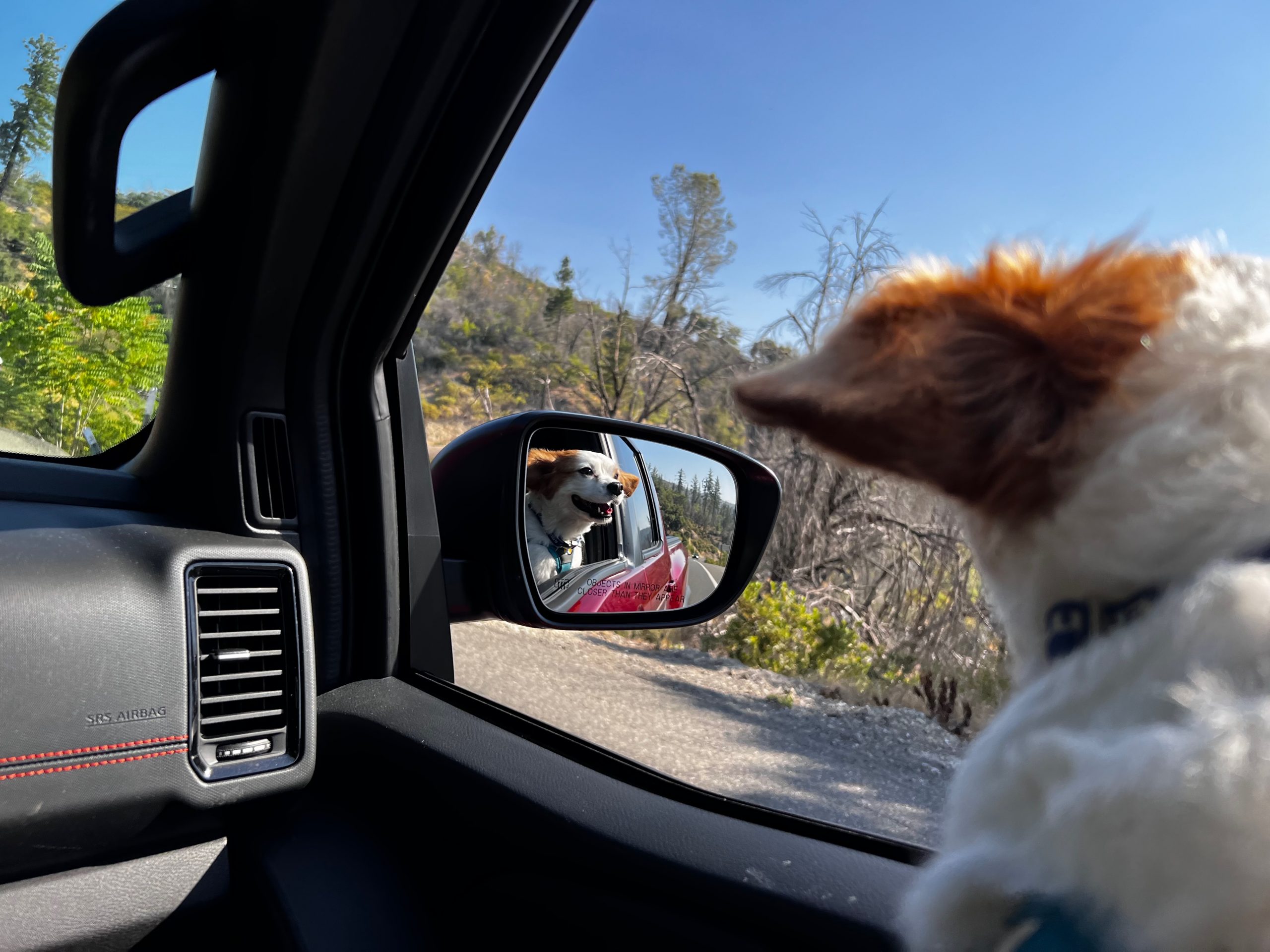 - Emma’s not satisfied with always being in the backseat. My lap does the trick. She loves looking out the front windshield up close.