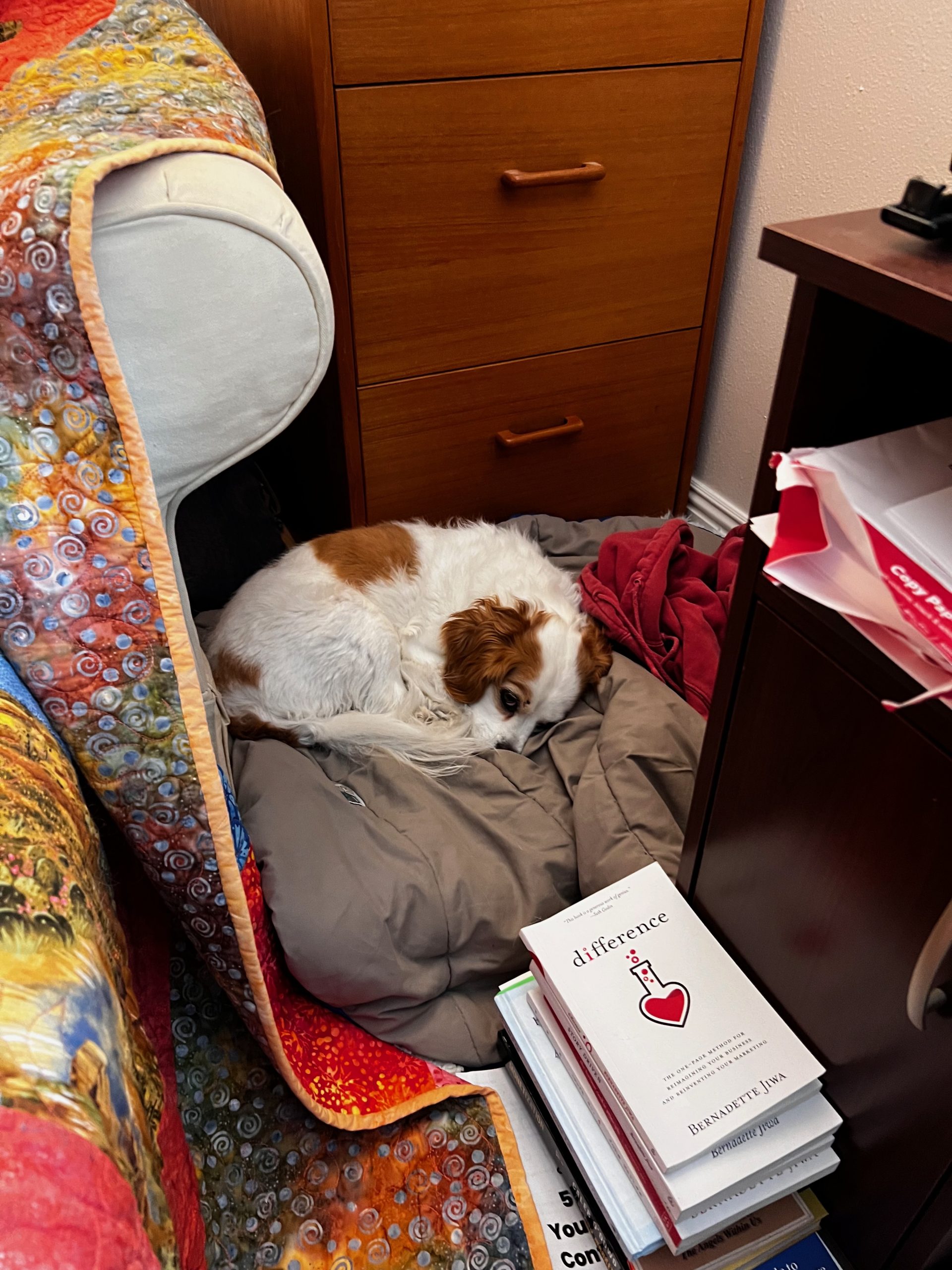 - What dog doesn’t like curling up in their owner’s office between all the furniture?! It is a cozy, safe place, even tho it’s a bit crowded in here.
