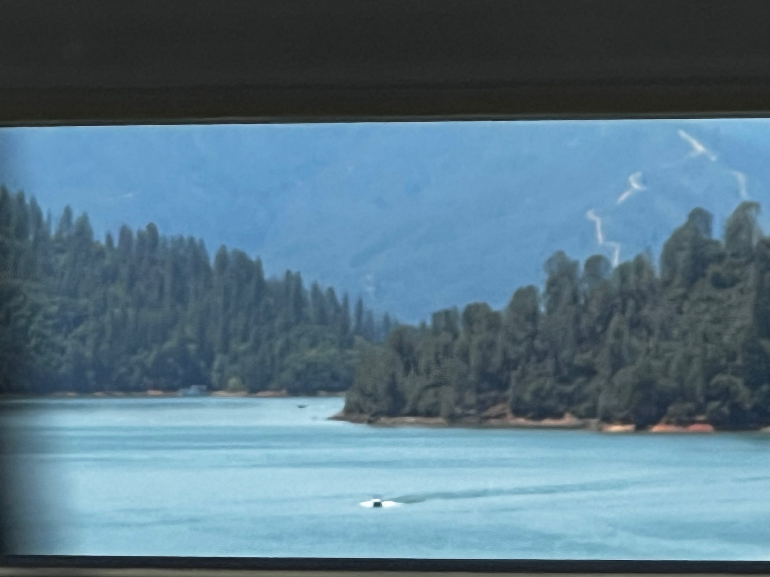 - Apologies, this is blurry. Here’s the story – we were riding in the car on the way home last weekend, and we passed over Lake Shasta. When you’re going across the bridge, you can’t get a good shot cuz of the bridge railings. This shot is taken between the railings from my iPhone. I thought, for being a bit blurry, it’s still kind of cool so I wanted to share with you. 🙂 You can see the mountain trails in the background.