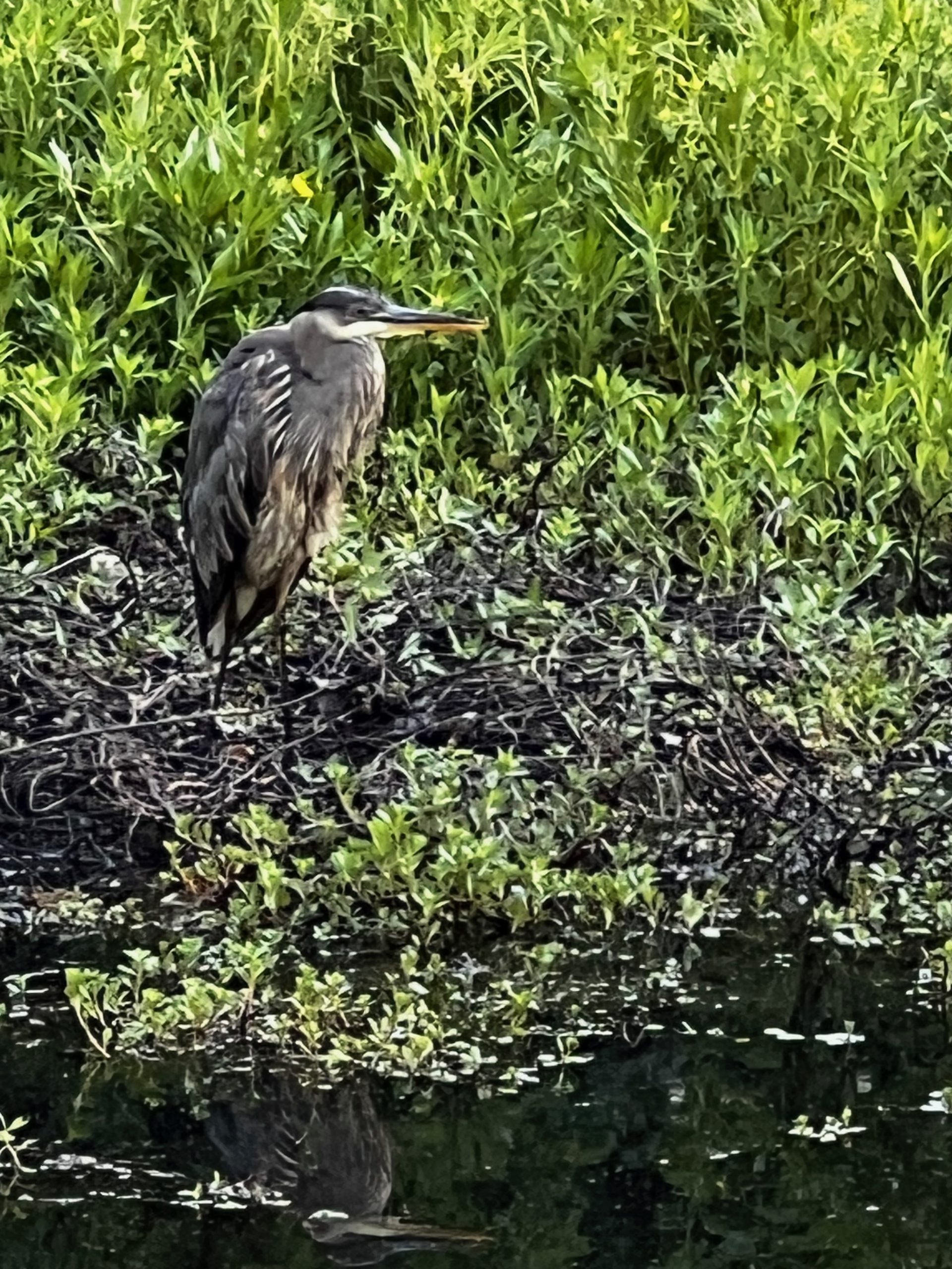 - Check out the blue heron buried in the greenery. Alice and I had an early morning walk with Emma along the Sacramento River Trail and ran into this guy.