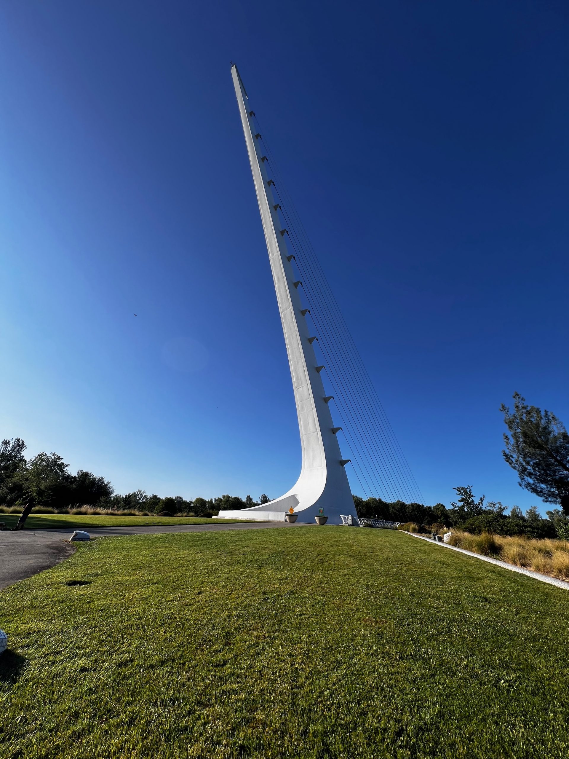 - This is Redding’s famous Sundial Bridge. It’s an active sundial, and it’s huge. Kind of cool though. You can also see the sundial part from this angle, which looks kind of weird. The bridge is hidden, off to the right.