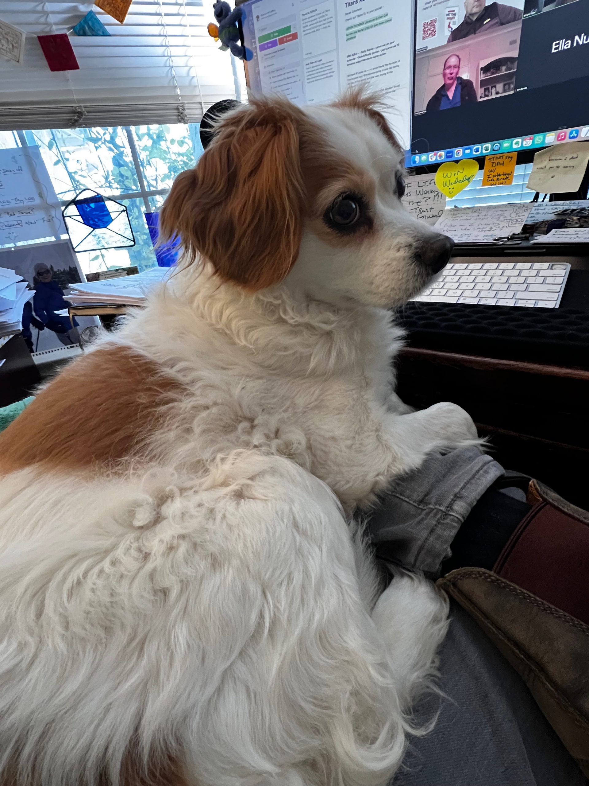 - Here she is on a Zoom call with me. She’s on my lap, you can see her on my jeans and part of my boot in the pic.