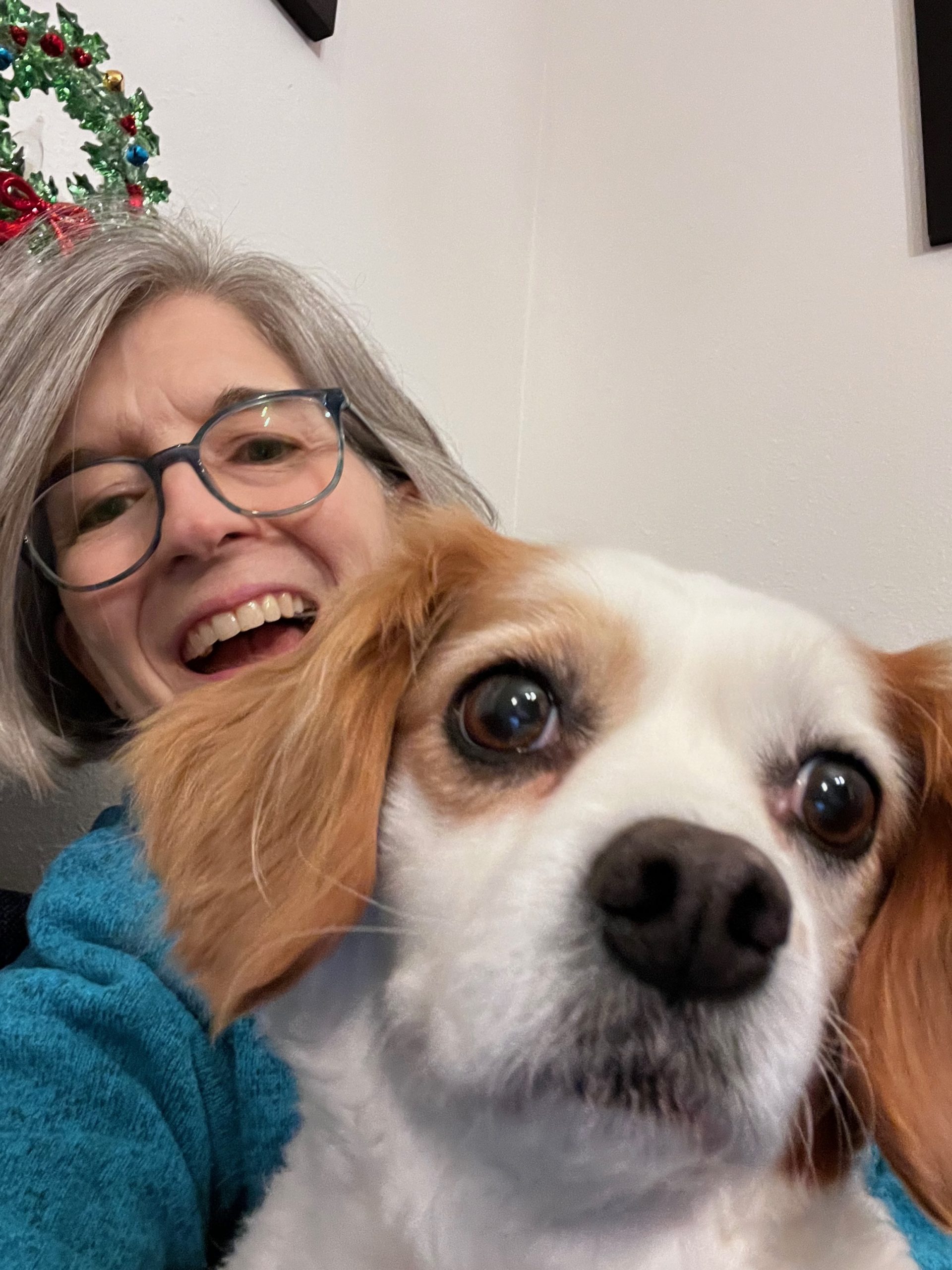 - Emma and I in her favorite position, on my lap, hogging the camera. That face… 🙂